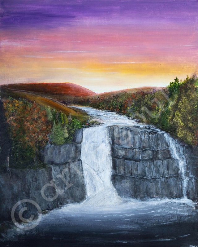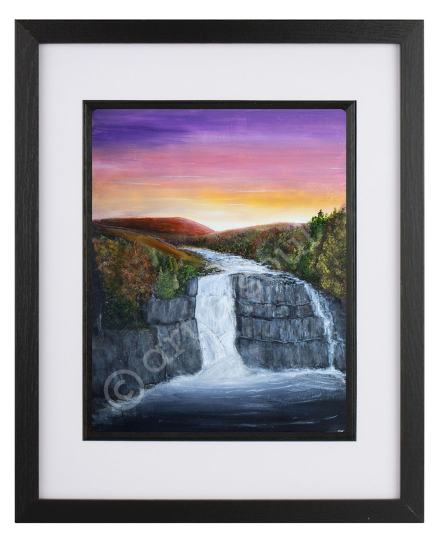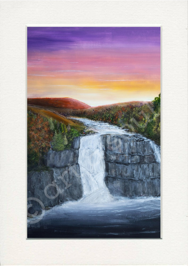 A signed print of an original painted by Mikey in acrylic paint called High Force, one of the most spectacular waterfalls in England located at Middleton-in-Teesdale, County Durham.
