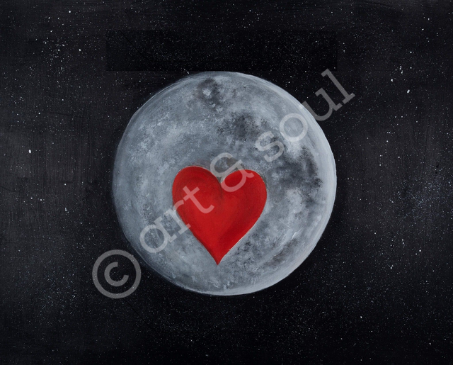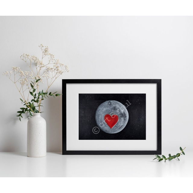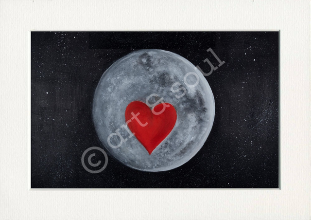 A signed print of an original painted by Mikey in acrylic paint of a painting called Love You This Far, a beautiful image of a love heart on a full moon.