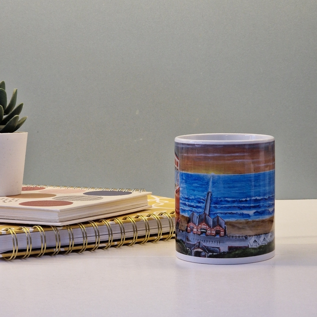 The ceramic mugs are 11oz, they have a chunky handle, and are supplied in a white presentation box. The Saltburn image is wrapped around the mugs.