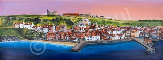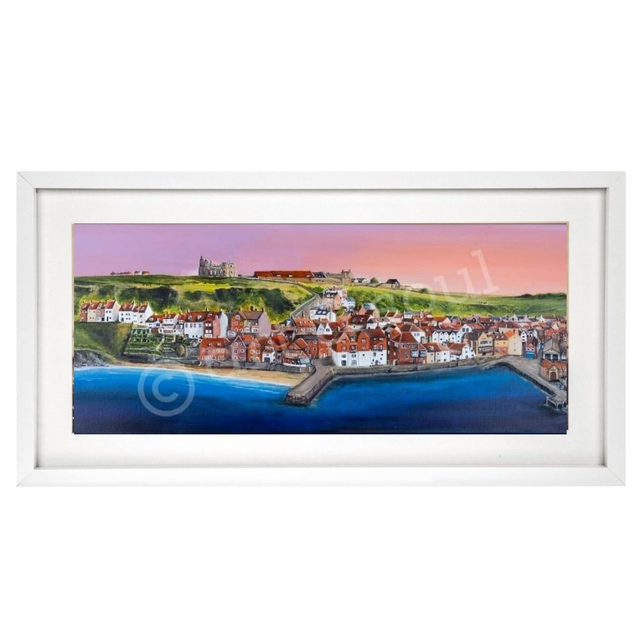 A signed print of an original painted by Mikey in acrylic paint called Sunrise at Whitby.