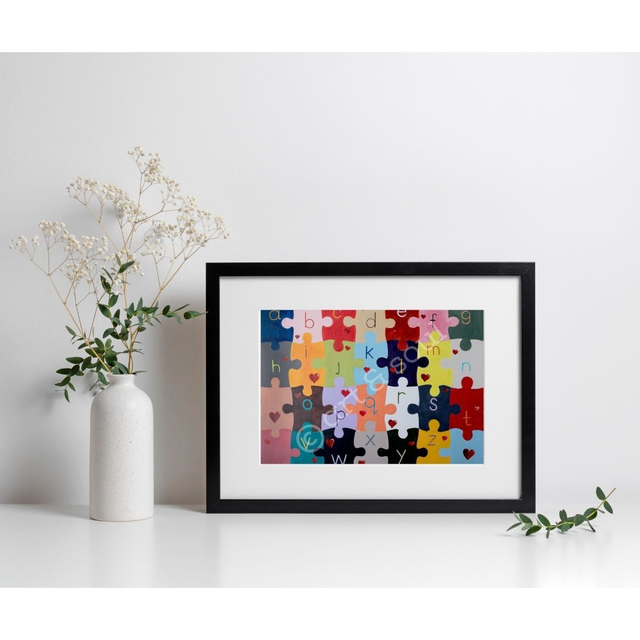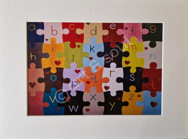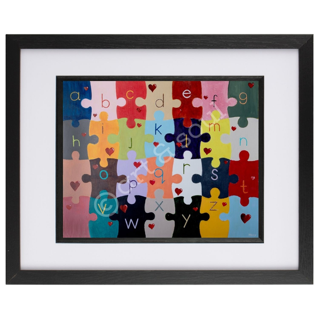 A signed print of an original painted by Mikey in acrylic paint called What's Missing - each letter of the alphabet is painted on this colourful artwork, apart from U!